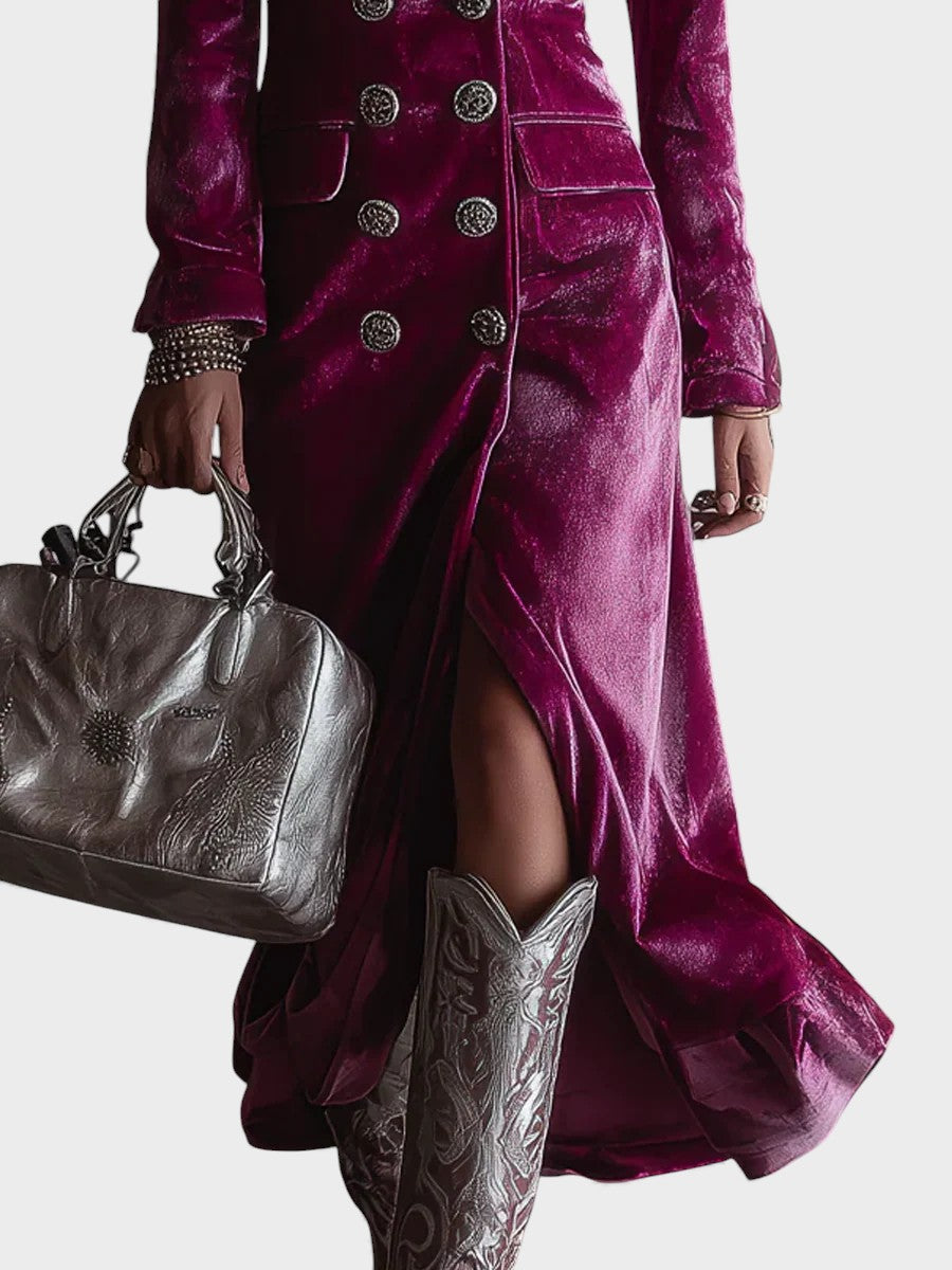 Alma™ fusiona la estructura de un blazer clásico con la sensualidad de un vestido maxi de terciopelo. Su silueta definida, los hombros marcados y los botones de inspiración retro crean un look poderoso, refinado y lleno de presencia.